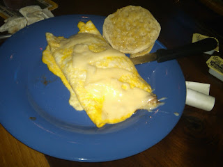 It took me awhile to figure out what I wanted to eat. I don't know why I have the hardest time picking. Well, actually I do know why - and I do it all for you baby! I am trying to find original things on a menu. Things that you won't find a lot of places or may just be unique. As you may have noticed, you will never see me eating a plain burger or a cheese quesadilla. I finally decided on the Chili Cheese Omelet (with jalapenos). ($6.79) It was served with either potatoes or grits and toast. I chose the English Muffin. Always dry, I can butter it myself!